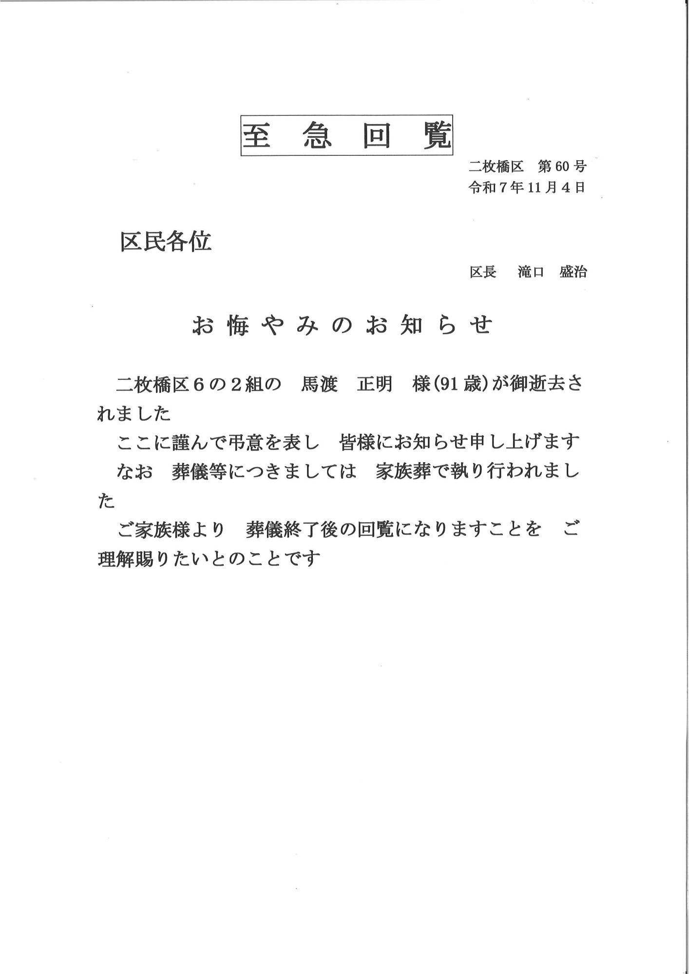 訃報 【二枚橋区60号】お悔みのお知らせ 6ー2組 馬渡正明様
