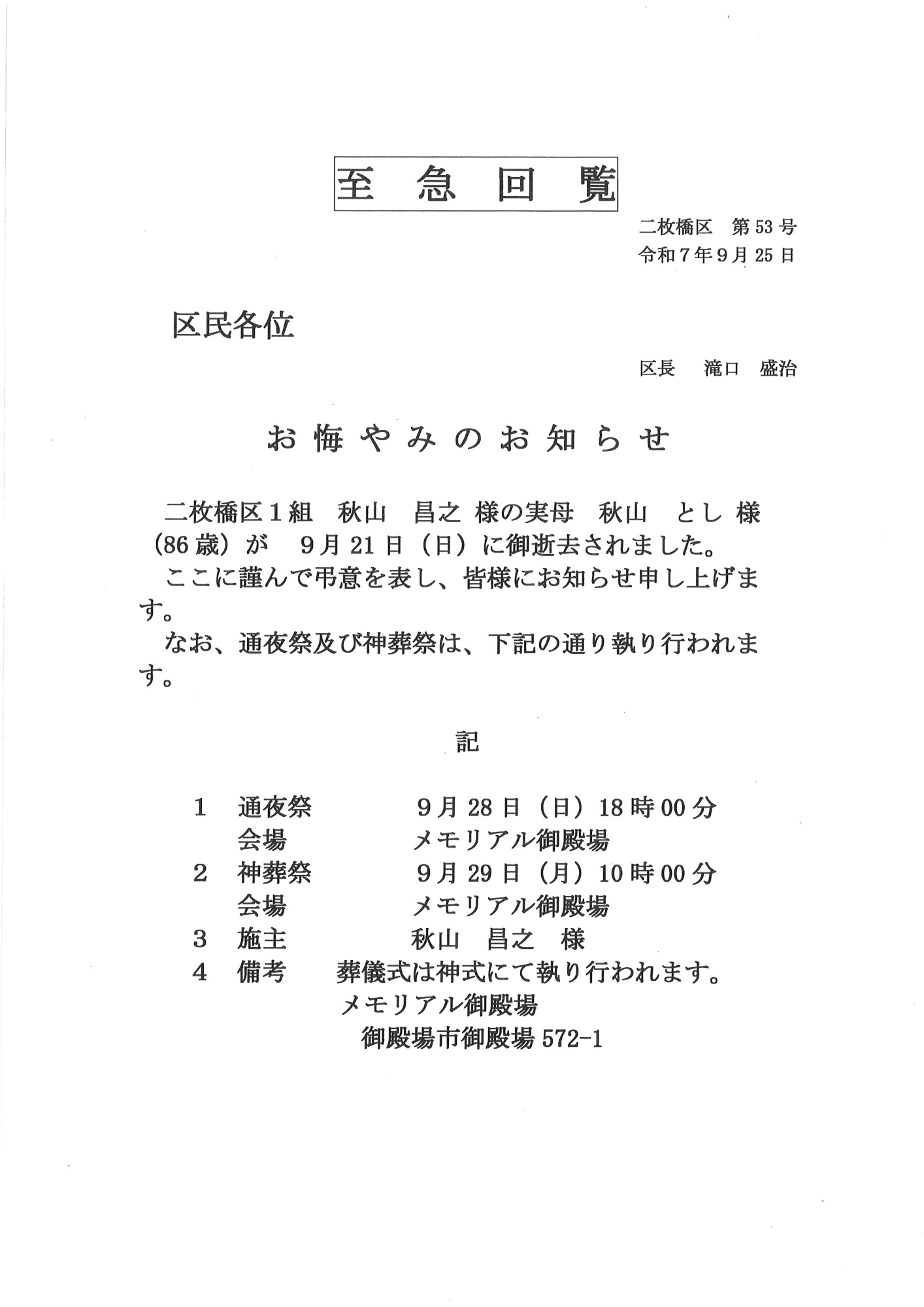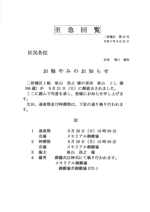 訃報 【二枚橋区53号】お悔みのお知らせ 1組 秋山とし様
