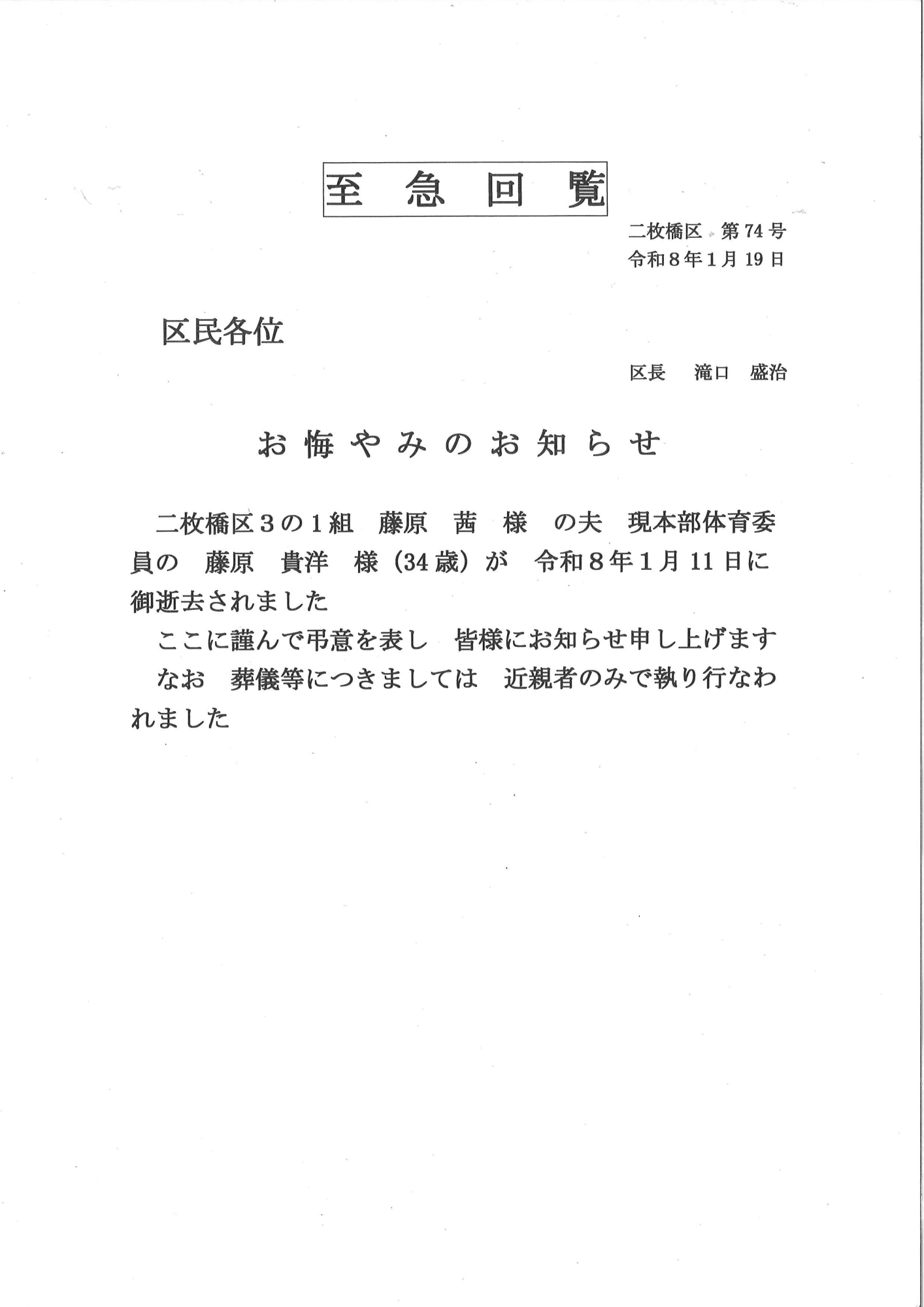 訃報 【二枚橋区74号】お悔みのお知らせ 3の1組 藤原貴洋様