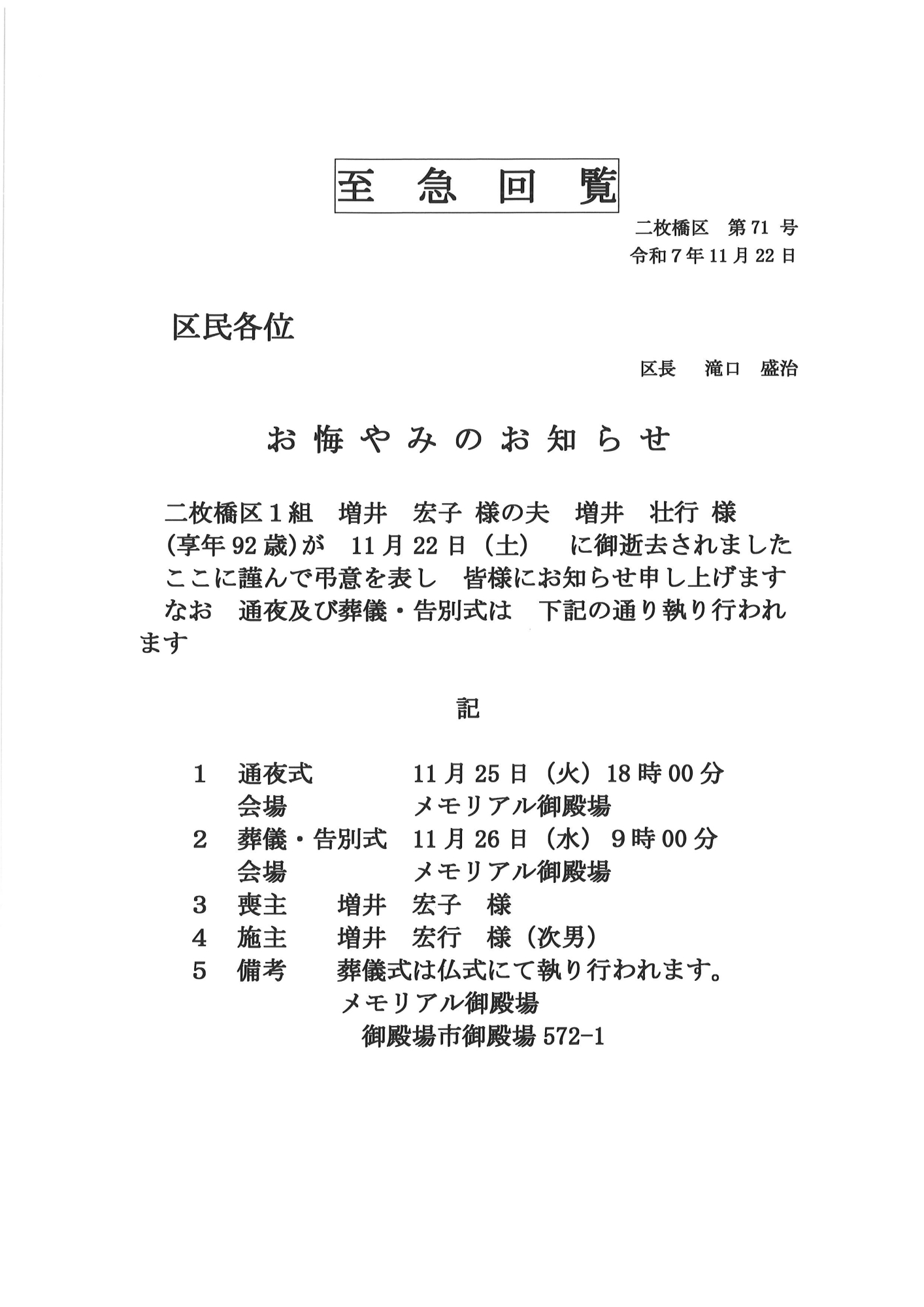 訃報 【二枚橋区71号】お悔みのお知らせ 1組 増井壮行様