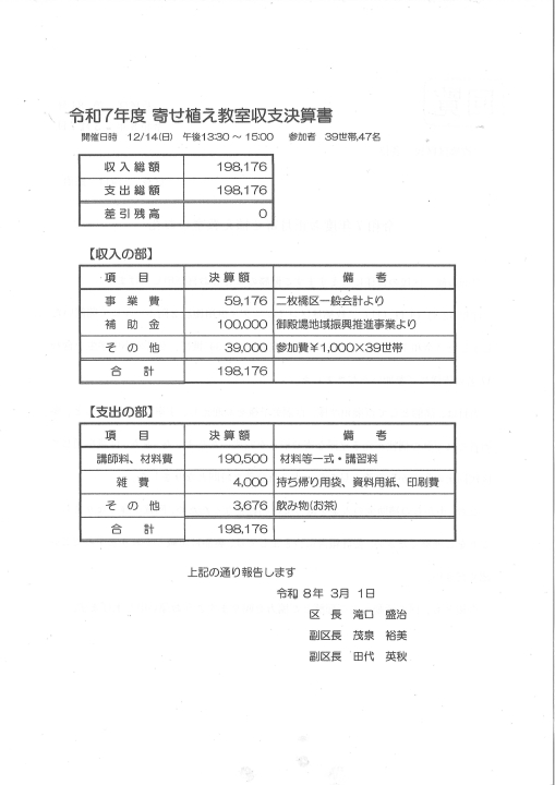 この度、令和7年度の総務担当副区長の池谷肇弘氏ですが、緊急な医療対応が必要になったため、ご辞退したいとの意向を示されました。そこで、区として、池谷氏の一日も早い完治を祈念し、受理させていただきました。