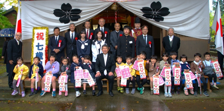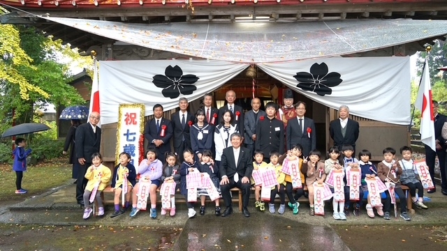 11月9日(日)に二枚橋浅間神社で、区内七歳児21人中15人のご参加をいただき、多くのご来賓にご臨席賜り、各組組長・協議員、中学生ボランティア(黒澤樹里さん、飯田梛々花さん、望月大輝さん)のご協力を得て、令和7年度二枚橋区七歳児祝いを実施しました。