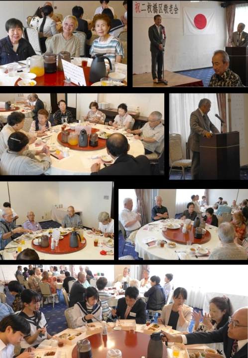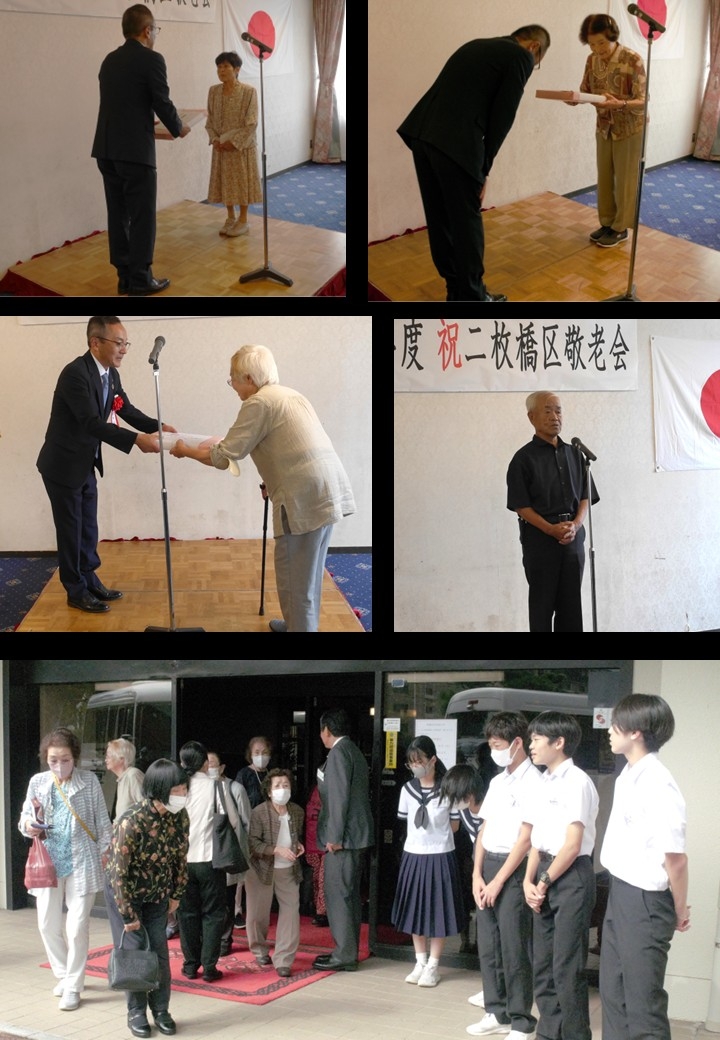 二枚橋区では、皆様のご長寿を祝福し、末永いご健康を願い、これまでの二枚橋区をはじめとした社会への功績をたたえ、その労をねぎらうとともに、皆様のこれからの生活への意欲と活力を一層高めていただくことを目指して、敬老会を実施しています。