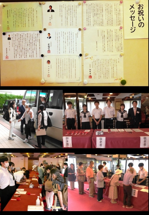 本日は、米寿該当者4名を含む長寿者の皆様40名にご出席をいただき、また、お忙しい中、御殿場市副市長 田代明人様、市議会議員 池谷晴一様、川上秀範様、御殿場財産区議員 齋藤信行様、二枚橋区相談役 深沢誠様、小宮山毅様にご臨席賜り、婦人会、広報委員、御殿場中学校PTA、御殿場中学校生徒ボランティアの皆様のご協力の下、名鉄菜館にて、二枚橋区敬老会が開催できますことに心より感謝申し上げます。