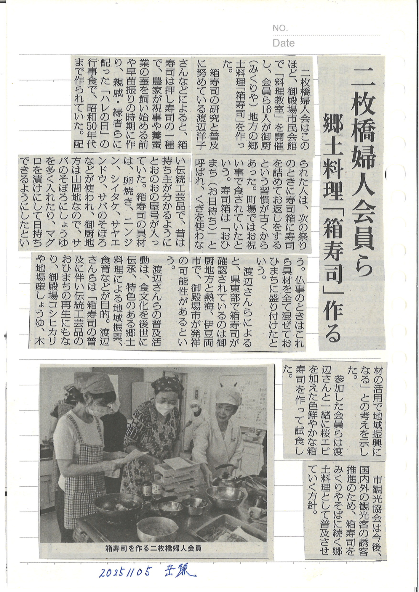 二枚橋婦人会員「箱寿司」体験を行いました 講師 渡邉洋子 様(3ー1組)