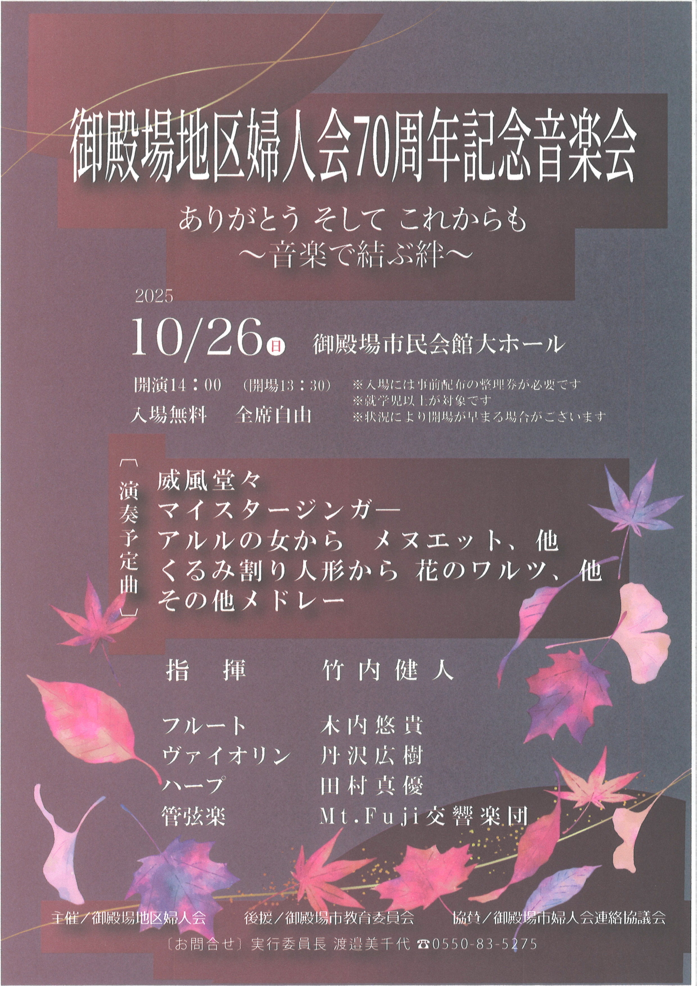 御殿場地区婦人会70周年記念音楽会視聴希望者(無料)募集について