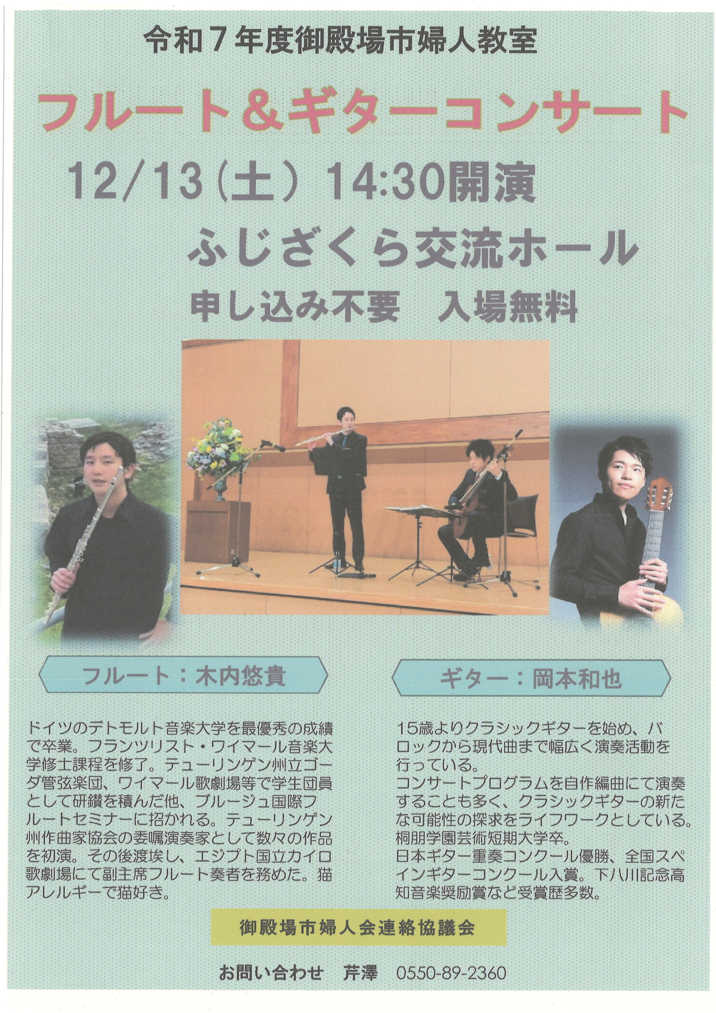 御殿場市婦人教室コンサート 12月13日 3の1組出身 木内悠貴氏出演